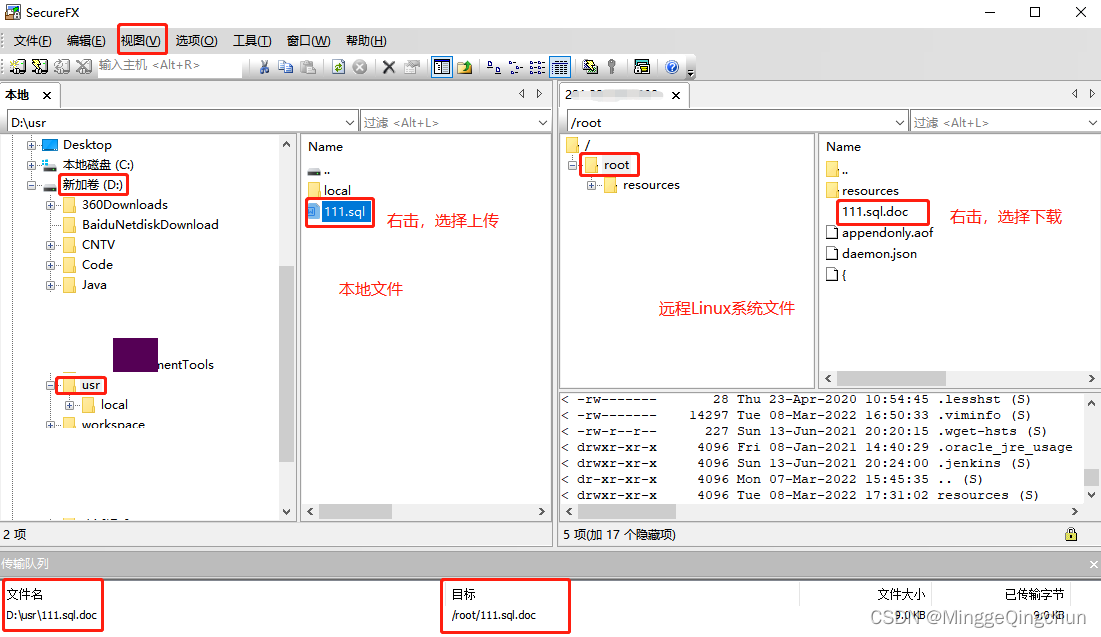 选择【视图】----> 【本地窗口】,就可以看到本地文件和远程服务器上文件路径