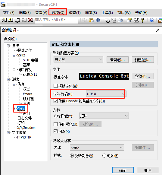 选择【选项】----> 【会话选项】,选择外观,将字符编码改为 UTF-8