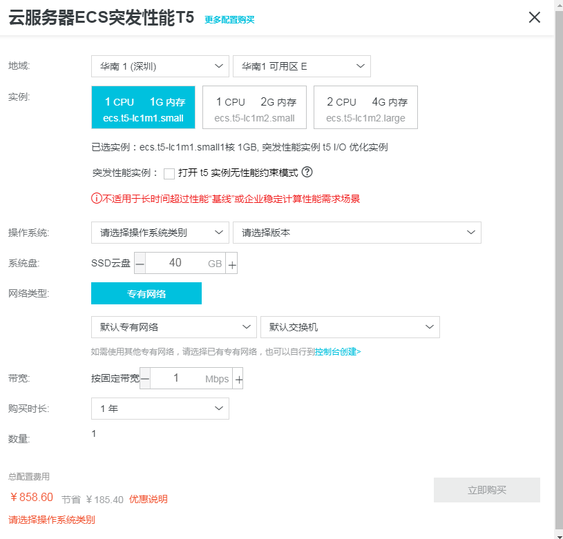 对于在校大学生或者上班族其实自己只是为了技术的一个积累和提升,自己完全可以买一个1G一核的突发性ESC实例就可以了,一年800多,一个月60多块钱,见下图