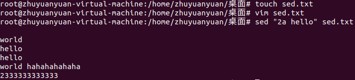 eg:把“hello”这个词插入到sed.txt第二行下(a是插入,2a就是在第二行插入),打印