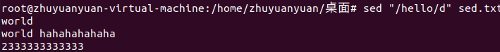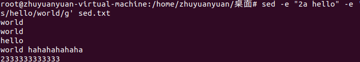 eg:既把“hello”这个词插入到sed.txt第二行下,又将sed.txt中的hello替换成world