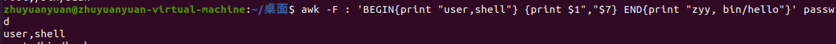 eg:只显示/ect/passwd 的第一列和第七列,以逗号分隔,在所有行前面添加列名user,shell。在最后一行添加“zyy, /bin/hello”