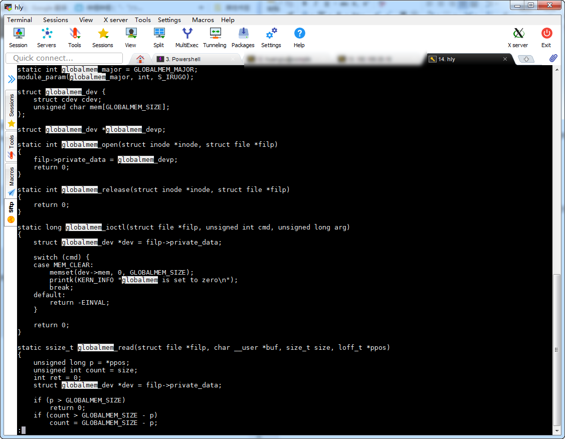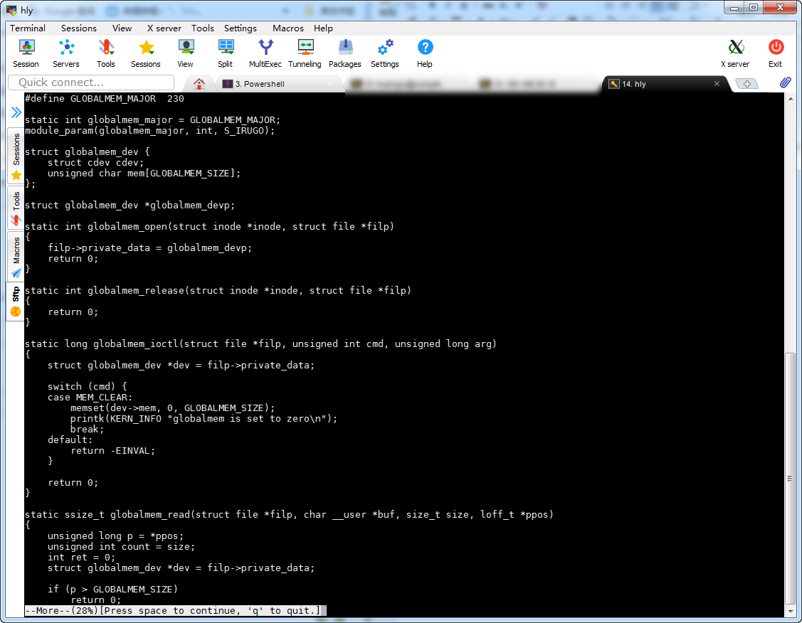 使用less命令查看globalmem.c文件,并在文件搜索”globalmem”关键词: