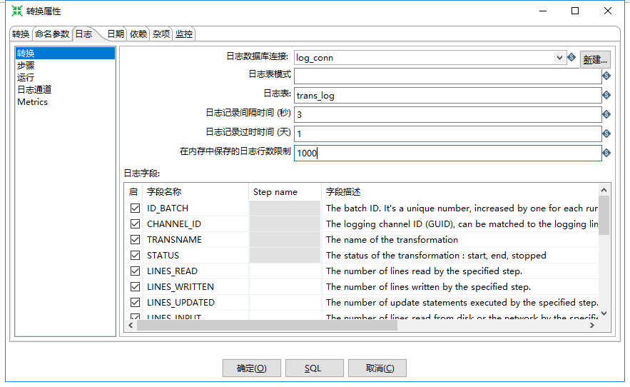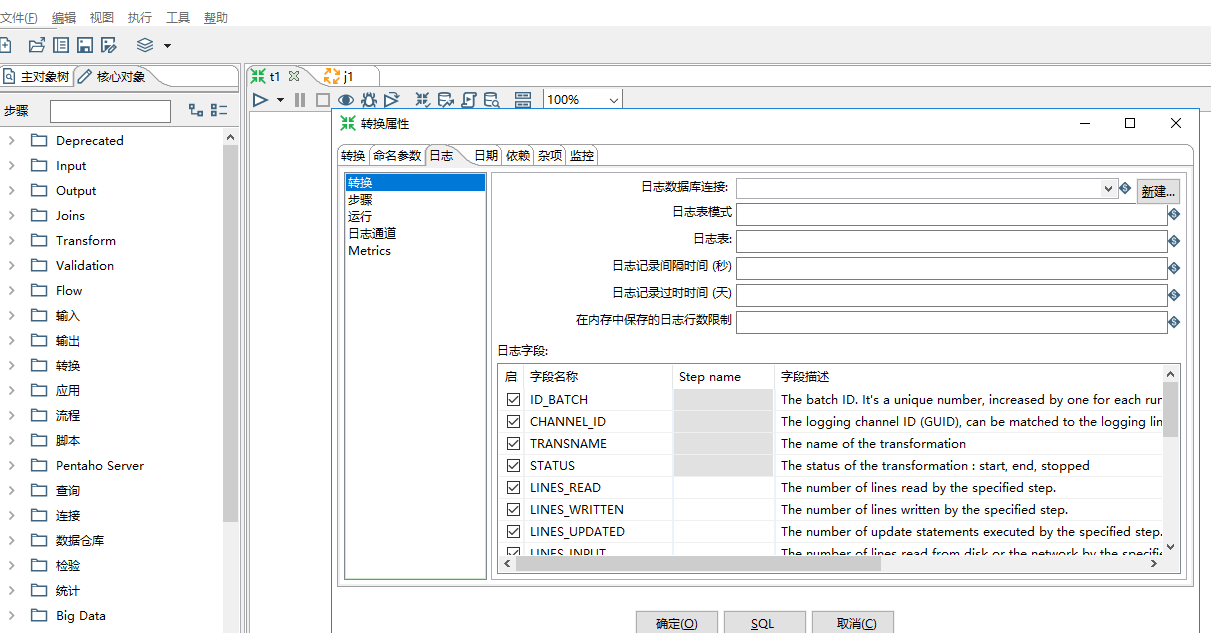 转换的日志设置在:编辑->设置;选择日志(作业同理)