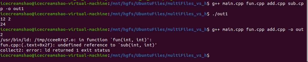 第二种形式的编译命令如下,可以看到并不需要.h文件的参与,同时先尝试了过程中,如果参与缺少一个cpp文件,会出现如下的报错。