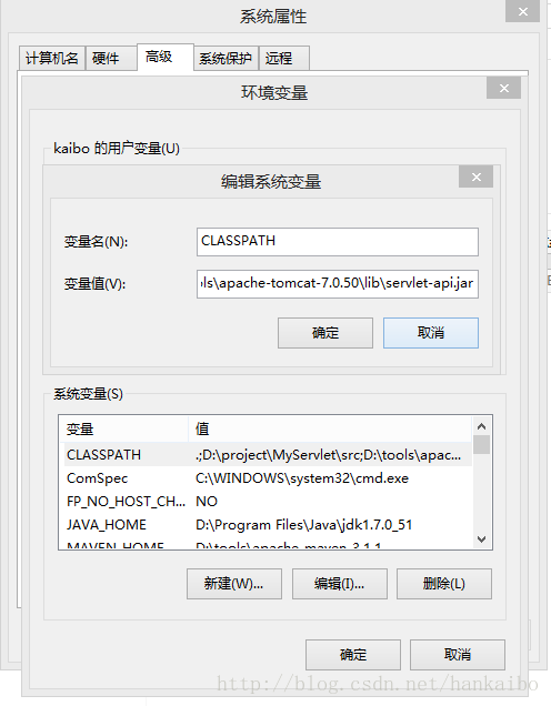 设置CLASSPATH,主要是为了告诉编译器Servlet类的位置,值为“.;D:projectMyServletsrc;D:toolsapache-tomcat-7.0.50libservlet-api.jar”,配置如下: