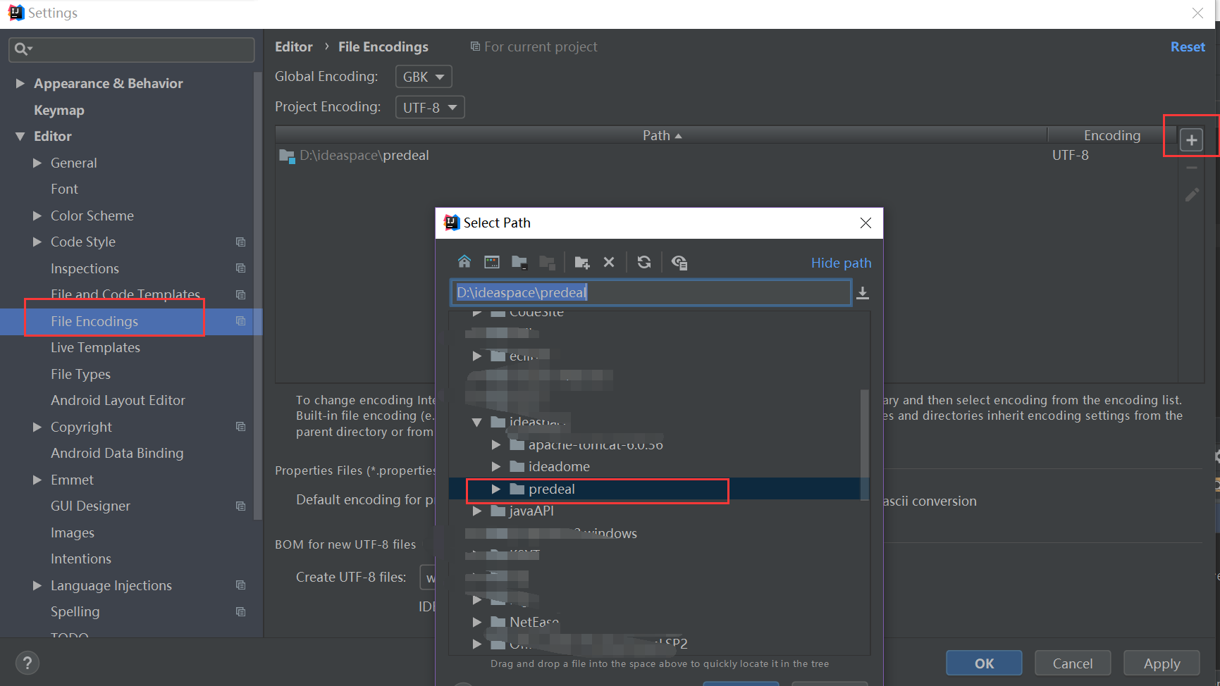 在File -》 Settings -》 Editor -》 File Encodings-》点击+号,选择你的项目或者部分包,在encoding中改成utf-8,(global encoding 全局编码 ,project encoding:项目编码)