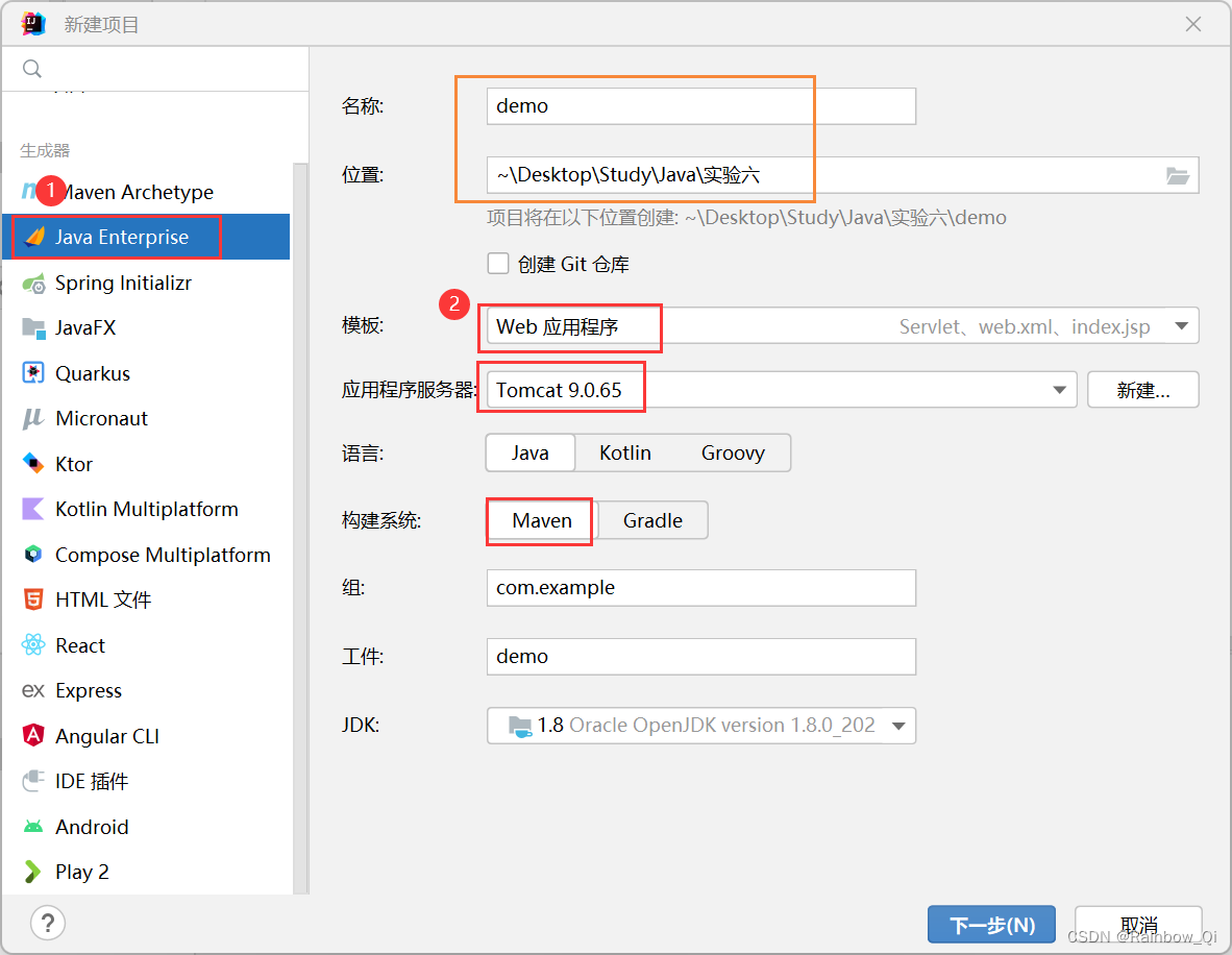 新建项目,选择Java Enterprise(Java EE),模块选择Web应用程序,并添加Tomcat服务器,相关选项如下: