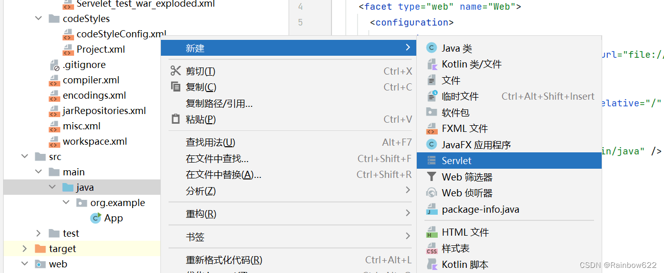 我们在创建的Servlet_test项目 -> src文件夹 -> main文件夹 -> java目录下,新建一个Servlet项目,并命名为FirstServlet: