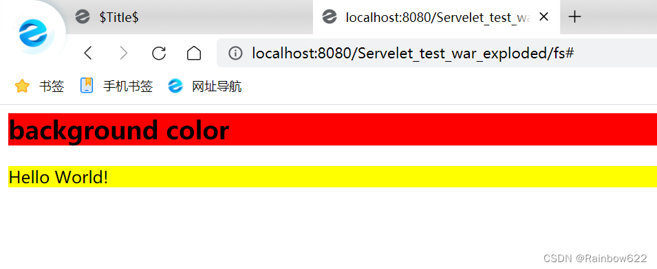 显然,这是有误的,我们的Servlet程序中应该会输出一个Hello World!,并有简单的css页面美化的设计,出现上述原因,我们可以回到2.6节最后一张图那个Tomcat服务器配置,根据我们的web.xml配置文件,在URL地址后添加 /fs (这个fs名字可以是任意的),指定访问的绝对地址。
