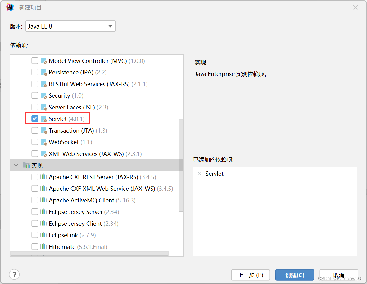 点击下一步,相关规范下自动勾选上了Servlet,然后点击创建