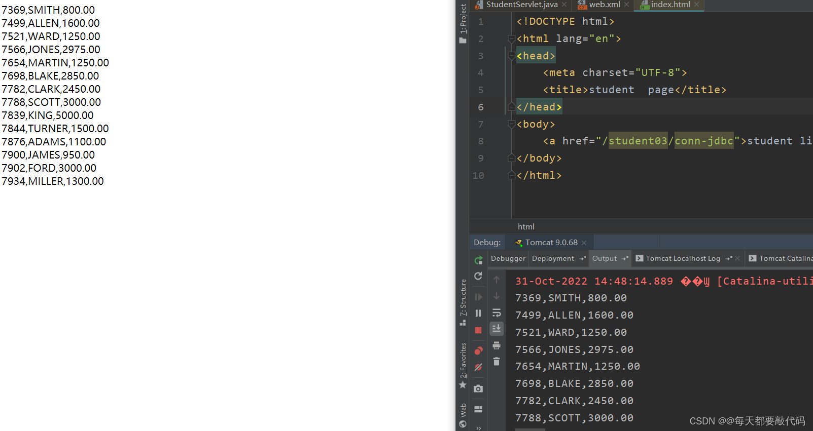 第九步:给一个html页面,在HTML页面中编写一个超链接,用户点击这个超链接,发送请求,Tomcat执行后台的StudentServlet。