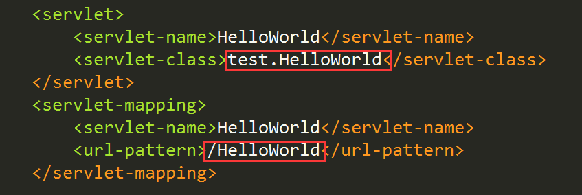 <?xml version="1.0" encoding="UTF-8"?> <web-app version="3.0" xmlns="http://java.sun.com/xml/ns/javaee" xmlns:xsi="http://www.w3.org/2001/XMLSchema-instance" xsi:schemaLocation="http://java.sun.com/xml/ns/javaee http://java.sun.com/xml/ns/javaee/web-app_3_0.xsd"> <servlet> <servlet-name>HelloWorld</servlet-name> <servlet-class>test.HelloWorld</servlet-class> </servlet> <servlet-mapping> <servlet-name>HelloWorld</servlet-name> <url-pattern>/HelloWorld</url-pattern> </servlet-mapping> </web-app>