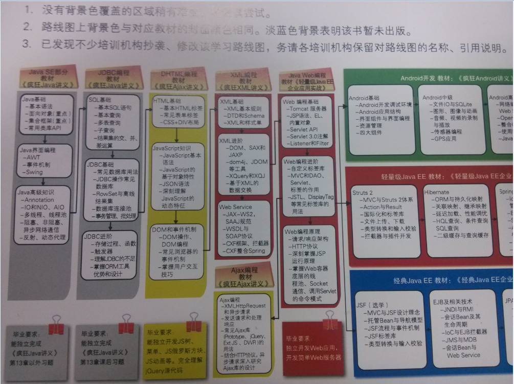 两张图拼起来看就对了,借鉴的是李刚的“疯狂Java学习路线图”,手机像素渣,图片不是很清晰,将就一下吧。说白了,在学习Android之前要具备一定的Java基础(Java SE 、JavaWeb、数据库等)。而如果要学的扎实并且有个好的就业岗位,以下基础知识需要全部具备:计算机基础知识(操作系统、计算机网络、数据结构、数据库、设计模式等)、C/C++、Java、Android、Linux。