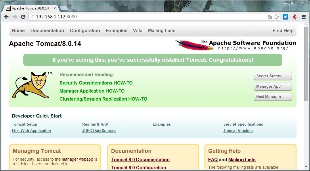 在浏览器中输入http://192.168.1.112:8080/(或者输入http://localhost:8080/也是可以的)。如果弹出如下界面,进入本地服务器的首页,表示tomcat安装成功并且启动起来了: