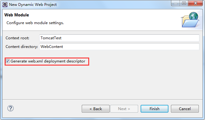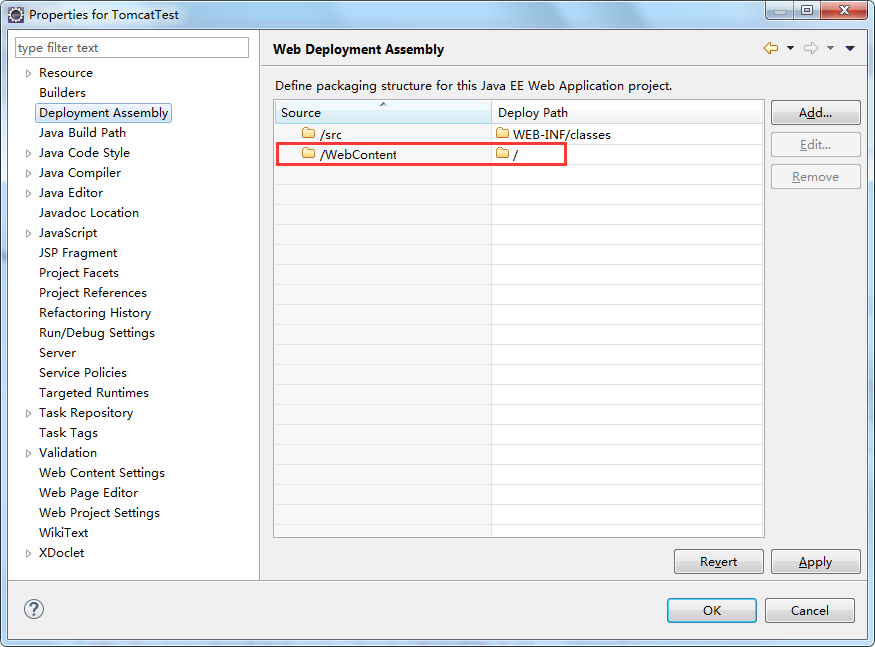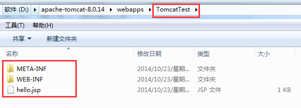 上图中,使用Tomcat的安装目录作为部署的位置,并修改部署的路径Deploy path(建议改成Tomcat的webapps目录下),然后保存即可。这时,重新运行程序。现在来到Tomcat的webapps目录下,发现多了一个TomcatTest文件夹(即工程文件名),并且文件夹下包含了工程文件中WebContent的内容:
