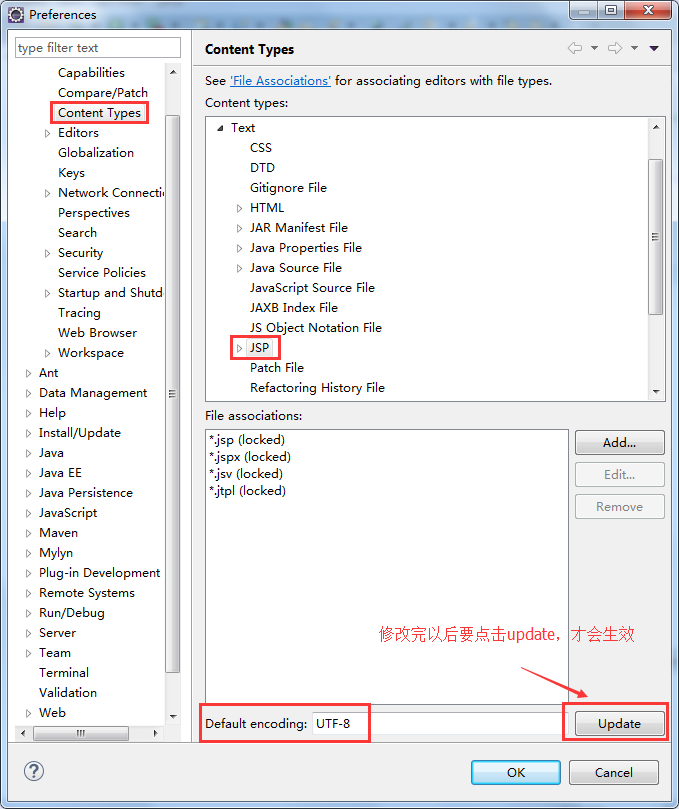 同样,我们还需要将文本内容的编码方式改为UTF-8(这个编码和程序无关),选择菜单栏Windows--preferences,打开如下界面,将编码方式改为UTF-8,并点击update: