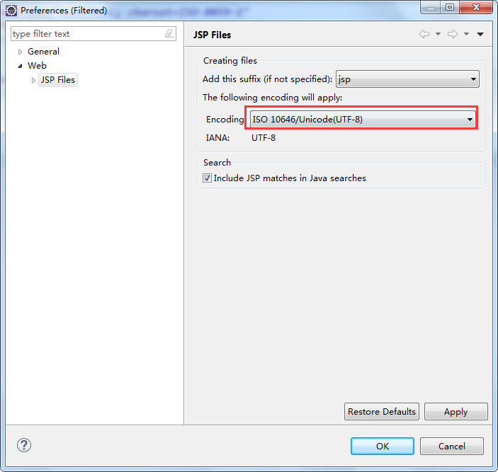 上图中,这种编码方式不支持中文。我们来修改一下JSP文件的编码方式,按上图所示,鼠标右击,选择"Preferences",弹出如下对话框: