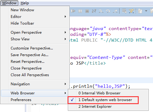 1 <%@ page language="java" contentType="text/html; charset=UTF-8" 2 pageEncoding="UTF-8"%> 3 <!DOCTYPE html PUBLIC "-//W3C//DTD HTML 4.01 Transitional//EN" "http://www.w3.org/TR/html4/loose.dtd"> 4 <html> 5 <head> 6 <meta http-equiv="Content-Type" content="text/html; charset=UTF-8"> 7 <title>hello JSP</title> 8 </head> 9 <body> 10 <% 11 out.println("hello,JSP"); 12 %> 13 </body> 14 </html>