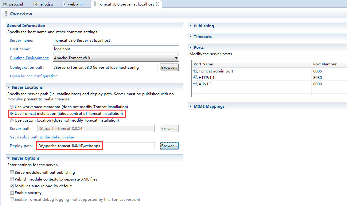 其实eclipse for EE已经包含了Tomcat服务的插件,但其也必须依赖Tomcat来启动。我们双击上图的红框部分,显示如下信息: