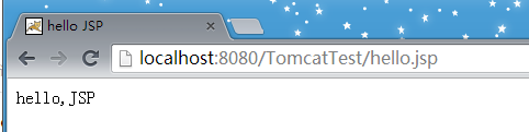 上图解释:当程序运行时,Tomcat会首先读取工程的配置文件,且名字必须为web.xml。当系统默认进入的链接为:主机名+端口+工程名时,服务器就会找上图中<welcome-file-list>标签里的页面(有好几个页面的话,就依次往下找);而标签<welcome-file-list>中并没有hello.jsp文件。所以,我们需要在浏览器地址栏输入:http://localhost:8080/TomcatTest/hello.jsp,才会将hello.jsp页面显示出来。效果如下: