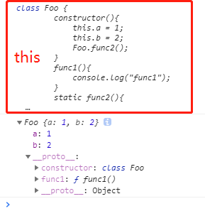 如下:实例foo的原型上没有func2方法。func2是类的静态方法,不在原型上,不被继承。静态方法供类,所以this指向类本身。