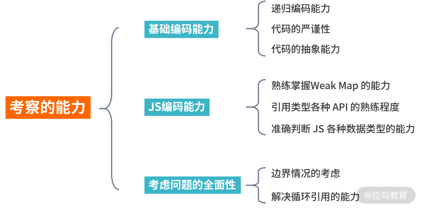 其实到最后我们可以看到,自己完整实现一个深拷贝,还是考察了不少的知识点和编程能力,总结下来大致分为这几点,请看下图。