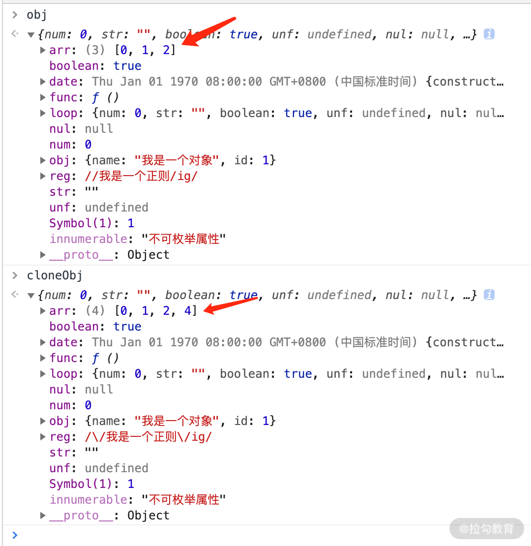我们看一下结果,cloneObj 在 obj 的基础上进行了一次深拷贝,cloneObj 里的 arr 数组进行了修改,并未影响到 obj.arr 的变化,如下图所示。