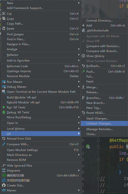 4.右击项目,点击unStash,并且找到你自己刚才创建的stash,之前修改过的代码就回来了