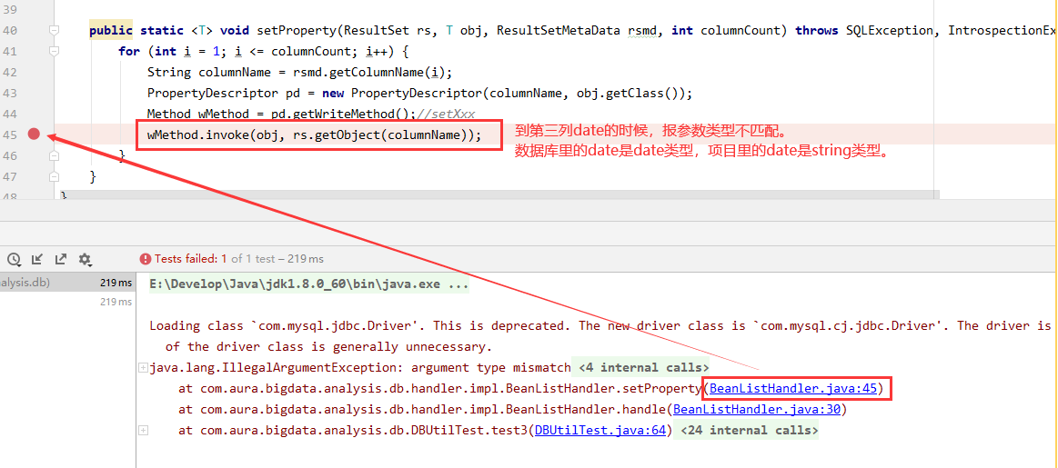 这次读取的表的第三个字段 在MySQL中的类型是date,在Java程序中Bean对象的属性类型是String,类型不一致,结果报错。