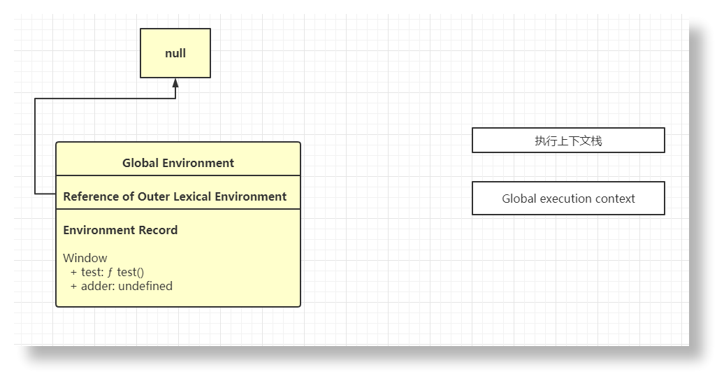 this关键词的值为window对象,创建全局环境(Global Environment)。全局对象下有adder,test等变量和函数声明。
