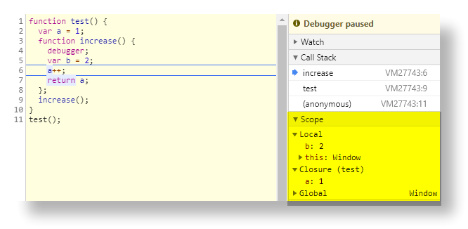 我把debugger置于内部函数increase中,调试时我们直接看右侧的高亮部分,可以发现,Scope中存在一个Closure(闭包),Closure的名称是外部函数test的函数名,闭包中的变量a是在函数test中定义的,而变量b是作为本地变量处于Local中。