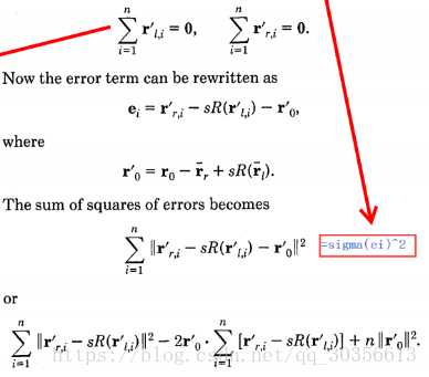 上式共有三项,其中中间项结果为0,因为r’坐标为中心化之后的,因此其和为0,另注意到最后一项一定为大于等于0的项,因此我们只需计算第一项的最小值,然后让最后一项为0即可得到该式的最小值。并以此计算出平移矩阵