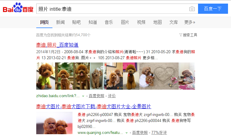 2)举个例子: 找萌宠泰迪的图片,就可以在搜索框中这样写: 照片 intitle:泰迪;