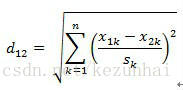标准化后的值= ( 标准化前的值 - 分量的均值) /分量的标准差 经过简单的推导就可以得到两个n维向量a(x11,x12,…,x1n)与b(x21,x22,…,x2n)间的标准化欧氏距离的公式: