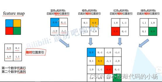 求一个像素点的相对位置索引就是求该像素的绝对位置索引与其他像素点的绝对位置索引的差,为了避免出现相同的位置索引,则采用以下方法进行解决。首先偏移从0开始,行标,列标加上M-1,其中M对应的是窗口大小。然后再以行标乘上2M-1。再将行标和列标进行相加。通过以上步骤就可以将二元坐标转换成了一元坐标。如下图所示将其一一对应即可。