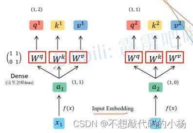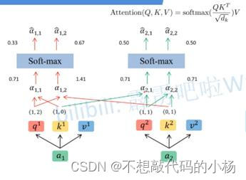 首先假设我们的输入数据为X1和X2,通过Embedding层会将数据映射到一个更高的维度得到对应的a1和a2,再通过W^q,W^k,W^v参数矩阵生成对应的q,k,v(这里的参数矩阵对所有的参数矩阵都是共享的),这里的q会去匹配每一个k,v代表的是。