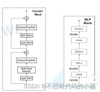其过程是首先输入后进行一个归一化处理,紧接着再通过一个多头注意力机制,然后再通过一个Dropout层随机失活神经元来防止出现过拟合的现象。然后再与先前的输入结果残差相加,再送入另一个LayerNorm层。然后再送入一个MLP多层感知机。MLP的结构如图中右半部所示