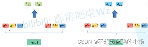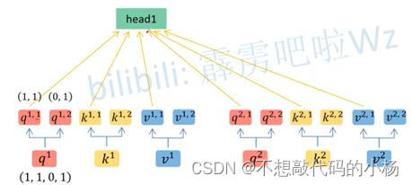 多头注意力机制和自注意力机制类似,将输入的a与参数矩阵相乘得到对应的q,k,v这一步和自注意力机制相同,然后再根据Head的情况对所得的数据进行拆分(实际上就是均分操作)在下图中head的个数是两个,将所有的q,k,v都进行类似的拆分如下图所示