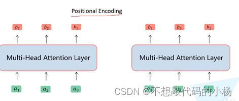 位置编码主要是为了下面这个问题而提出的。如下图我们将a2和a3的顺序进行调换。可以发现这样操作后对b1而言是没有任何影响的,但是这种现象是不合理的
