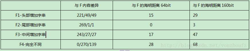 在数据去重过程中,都是先对文件进行分块,而后得到关于这个文件的所有指纹(SHA-1 digest),那么如果把这些fingerprints视为这个文件的单词,作为simhash的输入,效果会如何呢?接下来自己做了一个简单的测试,测试文件由自己构建的,下表是统计数据,F是基准文件,貌似效果没有那么明显。(其中243/27/27 表示两个文件有243个相同的指纹块(交集), 27是各自拥有的不同的块)