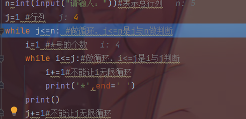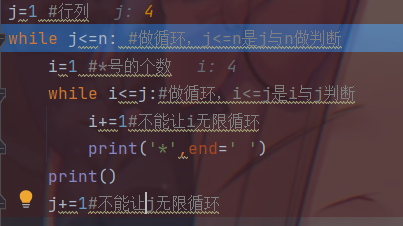 j是确定行数,而下面的while是用来让行数变多。i是显示*号的个数,而它下面的while是将i做循环,整体用了嵌套的方法来做到让计算机。