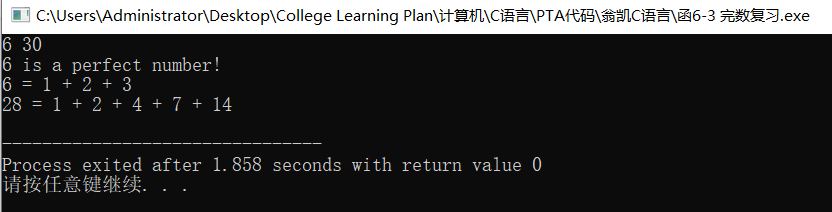 本题要求实现一个计算整数因子和的简单函数,并利用其实现另一个函数,输出两正整数m和n(0<m≤n≤10000)之间的所有完数。所谓完数就是该数恰好等于除自身外的因子之和。例如:6=1+2+3,其中1、2、3为6的因子。