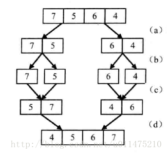 我们以数组{7,5,6,4}为例来分析统计逆序对的过程。每次扫描到一个数字的时候,我们不拿它和后面的每一个数字作比较,否则时间复杂度就是O(n^2),因此我们可以考虑先比较两个相邻的数字。
