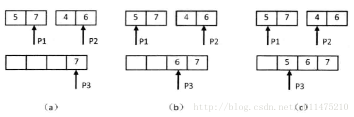 我们先用两个指针分别指向两个子数组的末尾,并每次比较两个指针指向的数字。如果第一个子数组中的数字大于第二个数组中的数字,则构成逆序对,并且逆序对的数目等于第二个子数组中剩余数字的个数,如下图(a)和(c)所示。如果第一个数组的数字小于或等于第二个数组中的数字,则不构成逆序对,如图b所示。每一次比较的时候,我们都把较大的数字从后面往前复制到一个辅助数组中,确保 辅助数组(记为copy) 中的数字是递增排序的。在把较大的数字复制到辅助数组之后,把对应的指针向前移动一位,接下来进行下一轮比较。