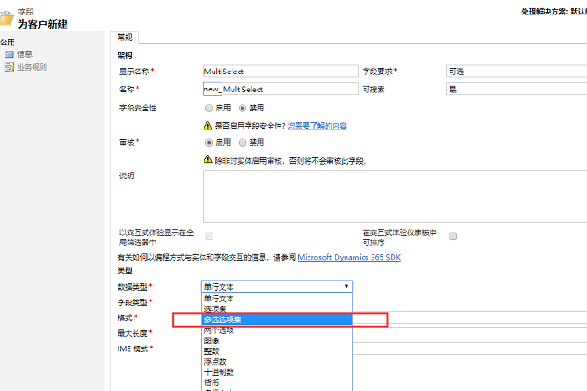 先来看下这个数据类型,方式和建选项集字段一样,只是数据类型那选择的是多选选项集