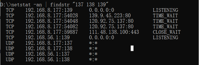 在命令提示符里输入netstat -an | findstr "137 138 139"