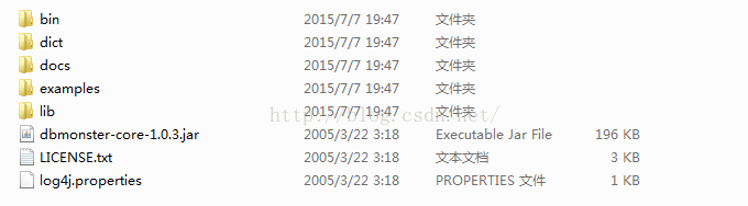 1. 下载DBMonster工具包 http://nchc.dl.sourceforge.net/project/dbmonster/dbmonster-core/v.1.0.3/dbmonster-core-1.0.3.tar.gz,解压如下: