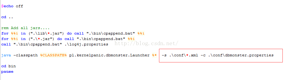 5. 进入bin目录,修改启动脚本dbmonster.bat,加入下图红色部分(-s .conf*.xml -c .confdbmonster.properties)