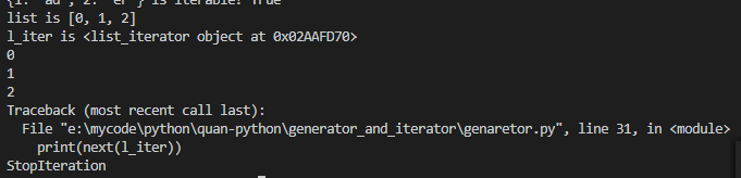 列表执行iter()函数返回一个迭代器对象list_iterator,执行next()函数可以实现遍历,因为列表的长度是3,超过列表的长度时,执行next()函数,会报StopIteration异常